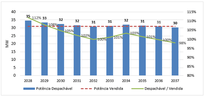 Após perdas, a disponibilidade de potência (DISPpot) é de 34,12 MW e assume-se que a potência a ser ofertada no LRCap é de 30,93 MW. A receita fixa se dá em R$/MW-ano, reajustado pelo IPCA. O empreendedor tem como estratégia um único augmentation[1], de 10,03 MWh (dois contêineres de 5,015 MWh), no final no quinto ano (ago./33).