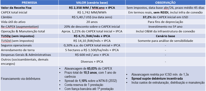 Tabela 1 – Principais premissas do cenário base – BESS Longa Vida.