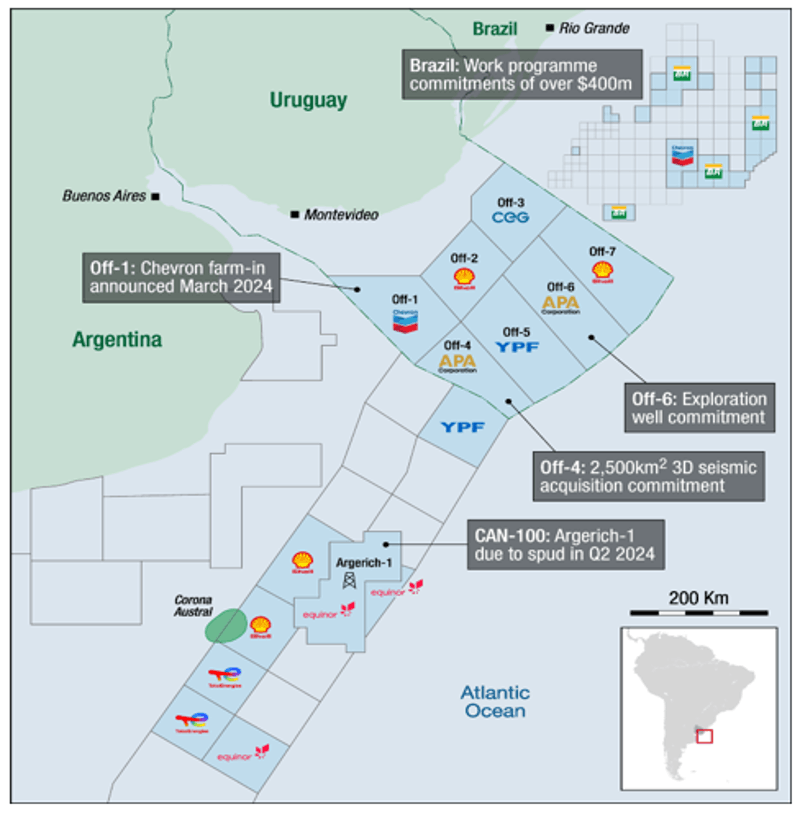 O segundo mapa deste artigo, publicado originalmente pela GeoExpro no artigo “Chasing Orange Basin success on the South American conjugate margin”, de autoria de Jonathan Leather – Nventures, em 15/05/2024, revela a posição das empresas empenhadas em ter sucesso na contraparte sul-americana das bacias da Namíbia.
