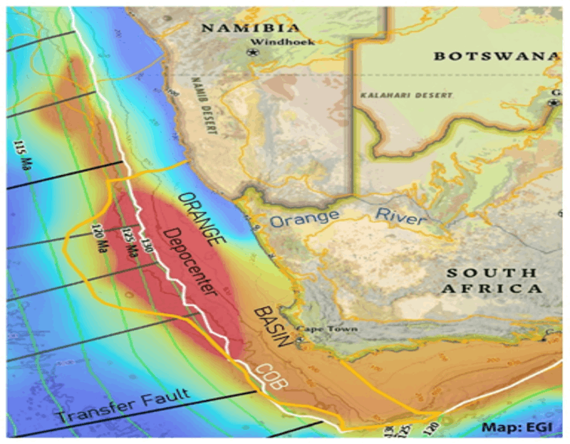 O sucesso exploratório em águas profundas do setor namibiano da Bacia de Orange levou à perfuração de 24 poços exploratórios, com índice de sucesso muito elevado, acima de 75%, para bacias ainda não totalmente conhecidas. Perfurações em águas acima de 2.000 m encontraram reservatórios a mais de 3.000 m abaixo do leito marinho e as primeiras estimativas apontam para reservas contendo 35% de óleo leve, 40% de condensado e 30% de gás. A Bacia de Campos, usada como referência, tem 85% de óleo leve, 10% condensado e 5% de gás associado.