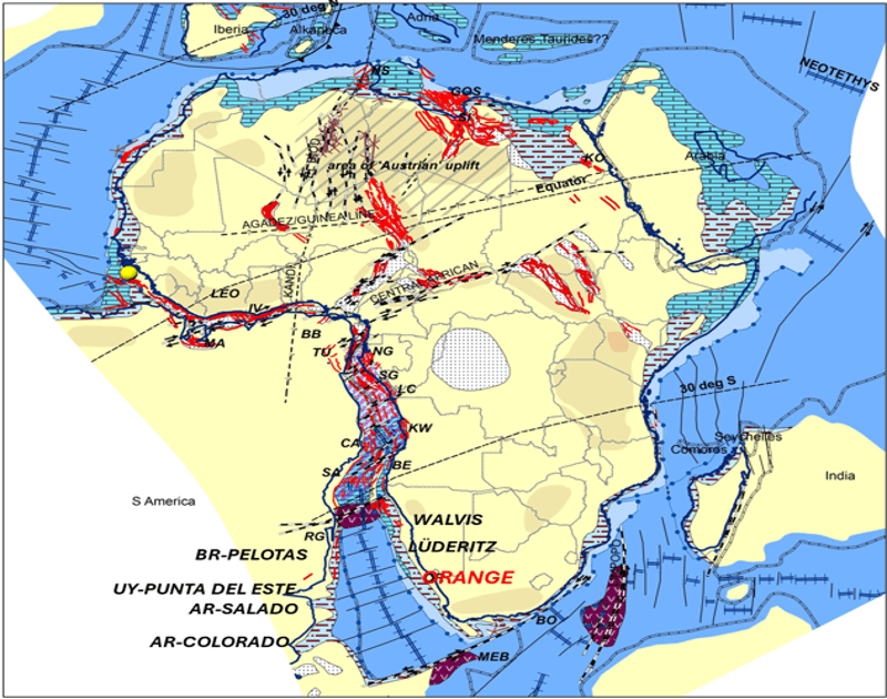 O primeiro mapa neste artigo, extraído do Africa Geological Atlas (www.africageologicalatlas.com), mostra a posição relativa dos continentes africano e sul-americano ao tempo do Aptiano (118 milhões de anos atrás), indicando o contexto de golfo (que deu origem à marcante presença de sal) ao norte do eixo Rio Grande – Walvis Ridge, através do qual o mar ingressou do Sul para o Norte.